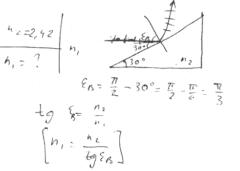 Алмазная призма находится в некоторой среде с показателем преломления n1. Пучок естественного света падает на призму так, как это показано на рис. Определить показатель преломления среды, если отраженный пучок максимально поляризован. (решение)